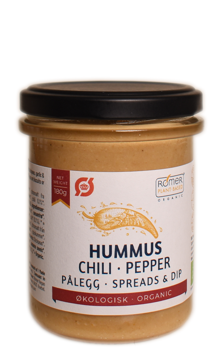 Økologisk, vegansk hummus fra Rømer Vegan med en delikat smag fra kikærter, hvidløg og citron samt et strejf af chili. Er velegnet på brød, i en sandwich, til små tapas, på kiks eller som dip.